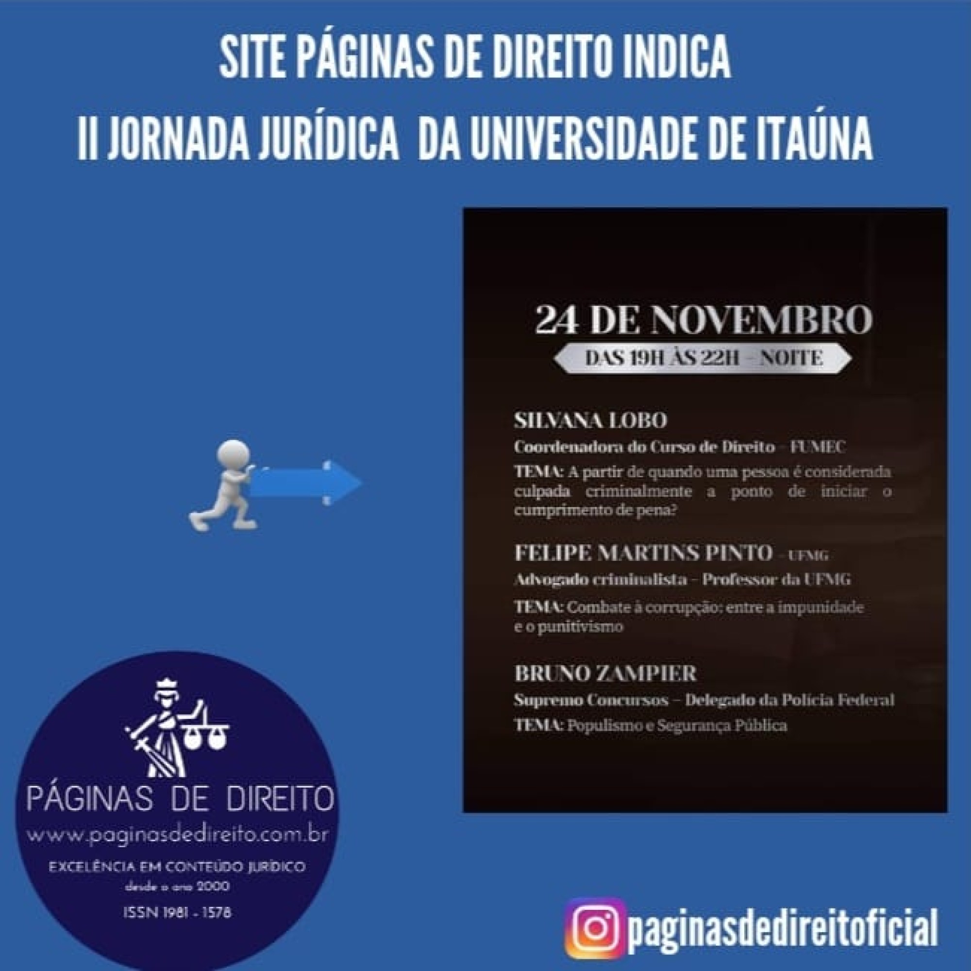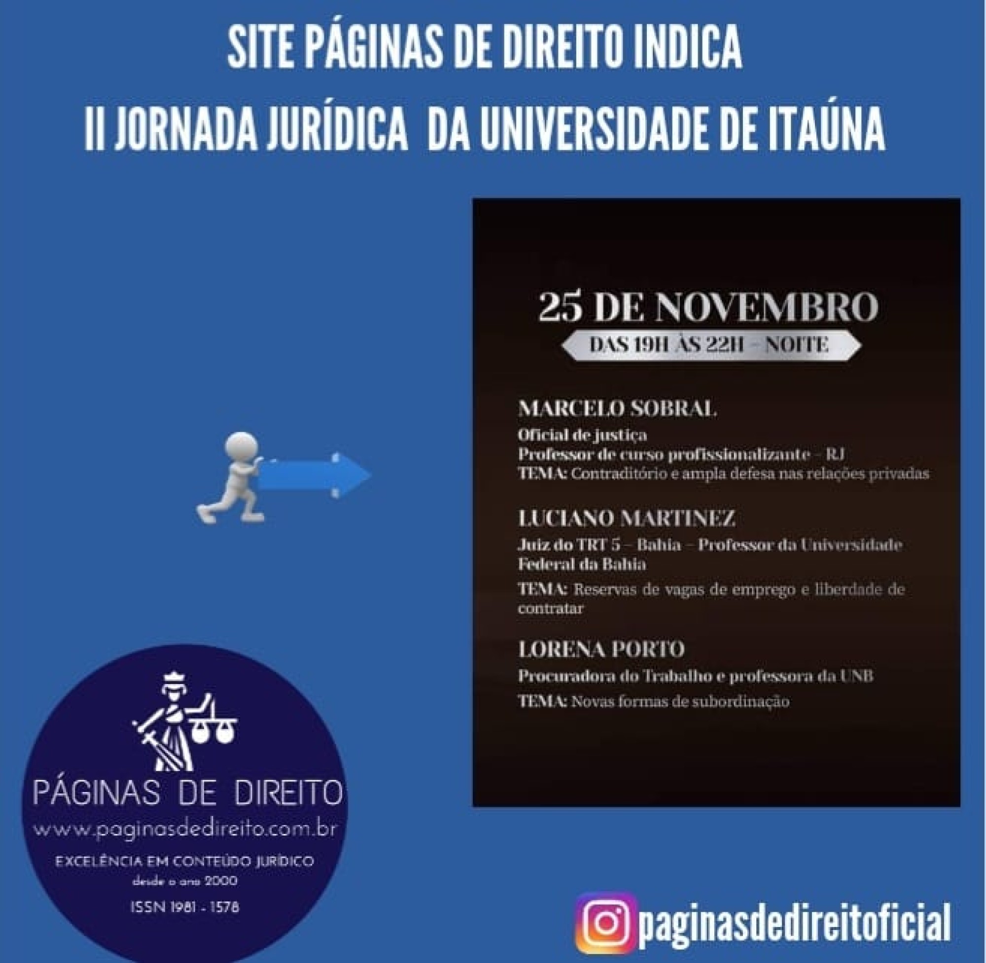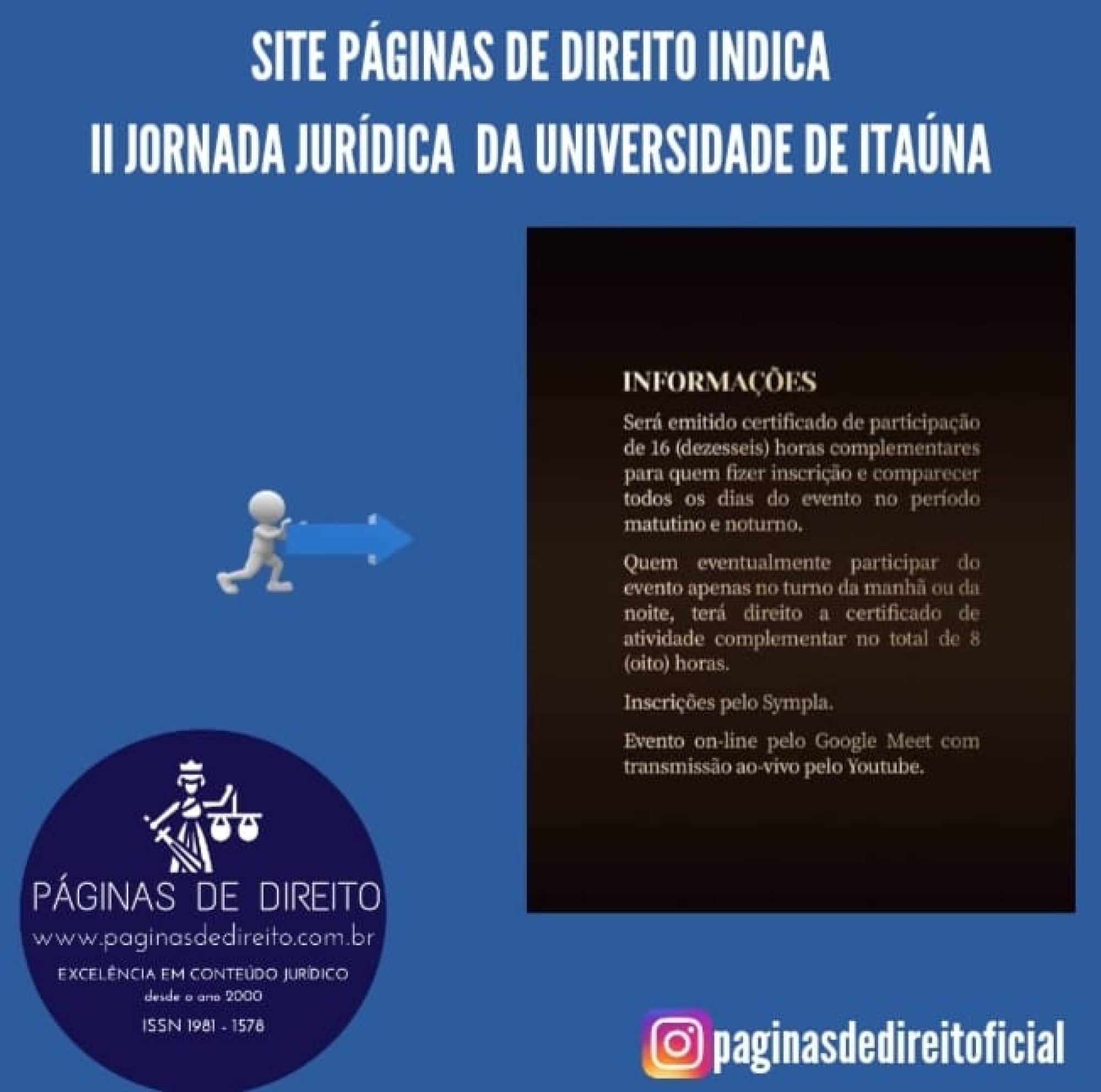 Inscrições: https://www.sympla.com.br/evento/ii-jornada-juridica-da-universidade-de-itauna/1412695